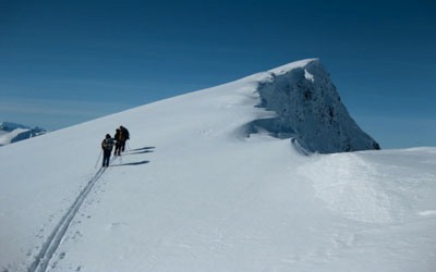 In the summer of 2008 my wife, Sue, and I did a very pleasant hut tour through the Jotunheim. This was a new area to me and I was very taken with the idea of repeating some of it as a ski tour. When I found that the Telemark Ski Co. were in fact running a trip in March 2009 not only visiting some of the huts I had walked to but also skiing some mountains including Glittertind, it was irresistible. To halve the possibility of my skis going astray during the two flights from Manchester I flew with Ryanair from Stansted. The £5 each way ticket finally cost over £100 with rucksack and ski carriage but it was still cheaper than from Heathrow or Gatwick and the bus transfer from Torp was very easy. I spent the night at the Hotel Spectrum close to the bus station and we caught the 9.30 bus to Tyen, changing at Fagernes. The Weasel picked us for an exciting half hour across the snowfields to Fondsbu. A quick ski and an excellent meal got us ready for our tour. It was snowing hard when we set off the following morning for Olavsbu. The weather cleared by mid-morning and we skinned up an un-named 1542m peak on the way. Un-staffed Olavsbu was delightful in the summer and a haven on a wild snowy night. We entered through a sort of tunnel in the snow. There were only nine people there in total and it was really cosy even if a trip to the loo required totally kitting up. We set off for Spitterstulen the following morning in a blizzard. We could hardly see from marker wand to wand. A long climb up was followed by a good ski down to a string of lakes. A climb and a nice ski down took us past the Leirvassbu hut (another of my summer huts) into the valley leading to Spitterstulen. We had to pole the whole way but I did see the big face of Kirkje that I’d climbed the previous year. Spitterstulen is used for winter courses for schools so it was a bit of shock to see dozens of children after the peace of Olavsbu but they were unbelievably well behaved. The next day a steep skin up, again in wild weather, followed by a long level section took us to the top of the valley down to Glitterheim. A good ski down was followed by another long plod down the valley. The hut was very quiet as it was actually still pre-season. The contrast in weather the following morning was amazing. Clear blue skies and dead calm. Although Glittertind was scheduled as the grand finale it was decided unanimously to go for it. It was skins on from the front door. Ours were the only ski tracks on the mountain after several days of blizzards. The final ridge is steep on all sides and there was masses of snow but the wind had been straight onto the slope so it wasn’t likely to avalanche on our side. The views all round were stunning and we could clearly see Galdepyggen apparently quite close. The first and steepest section had a lot of surprisingly heavy snow on but it got better and better ayou went down and a lot of the descent was fast, exhilarating paralleling on perfect snow. The weather for the next two days was perfect. We skied Nautgardsoksle (2089m) which was a straight skin up and ski down from the hut. The higher snow had icy patches and sastrugi on bits of the ridge but the main ski down was great.